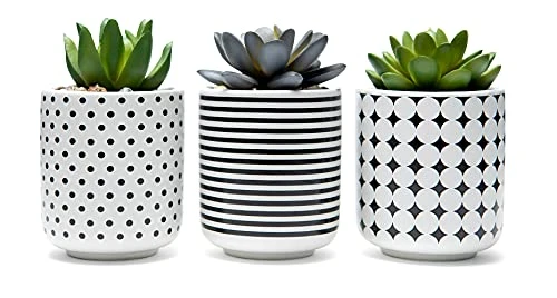 - ☘️ Transform your home and workspace – add a touch of modern sophistication with these three attractive plant pots. Each decorative pot has been beautifully crafted to add a touch of vibrance and fun. These coordinated designs are suitable for the kitchen, bedroom, bathroom, mantle, bookcase, office space. These really are the prefect pots for faux succulents. They look fantastic anywhere!