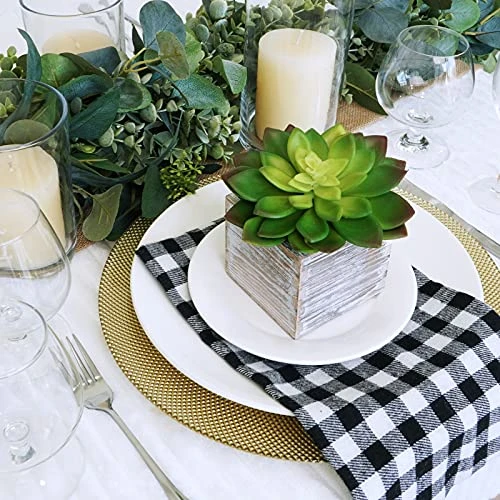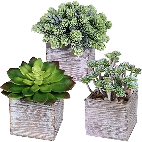 - Material: Fake succulents plants are made of plastic and pre-potted in rustic whitewashed wooden pots with natural pebbles. These wooden planters are made of natural aged pine wood and lightly hand painted off-white for a distressed finish. Each wooden planter is unique. Perfect for placing these potted plants in the garden or indoors as you won’t have to worry about them easily falling over. No watering or maintenance is needed for these artificial plants to stay fresh.