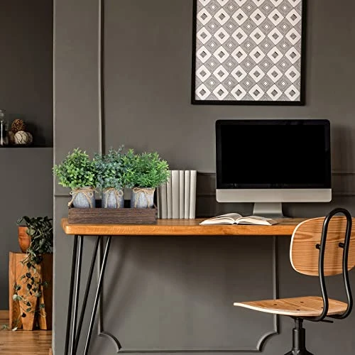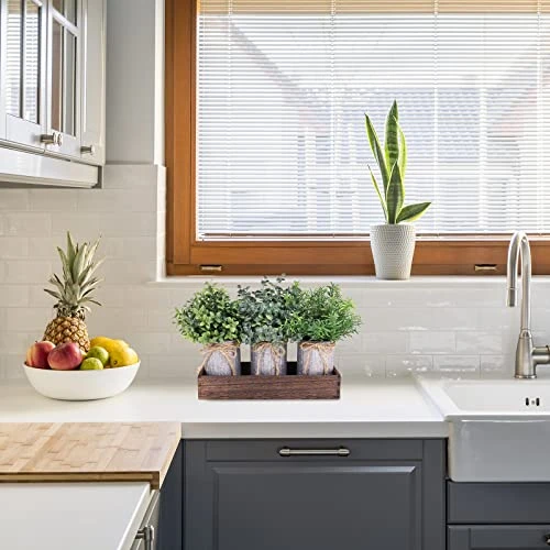 - Size: The faux stems are about 7.6″ tall and 7.8″-9.4″ wide. Each galvanized metal planter is about 3.1″ wide and 4.3″ tall, and each wood planter box is about 11.3″ L x 4.4″ W x 2″ H, perfect for holding the potted plants. The finished faux potted plants are about 9.1″ wide and 9.5″ tall. This artificial greenery arrangement is ideally sized to make a beautiful centerpiece on your table, also perfect for placement on desk, mantel, or shelves.
