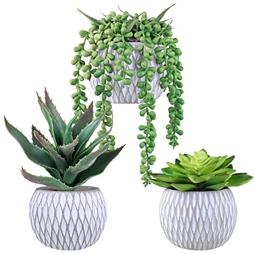 - Color: This set of potted succulent plants feature a variety of succulents in vibrant shades of green. They are lifelike and pre-potted in gray and white geometry pattern round pots with the pebbles. This hand-poured concrete pot is carved with a textured geometry design, emphasizing the graceful geometry. Simple yet unique, this array of faux potted succulents looks amazing on table, lend textural and geometric appeal to your modern home, and fresh charm to some neutral backdrops.