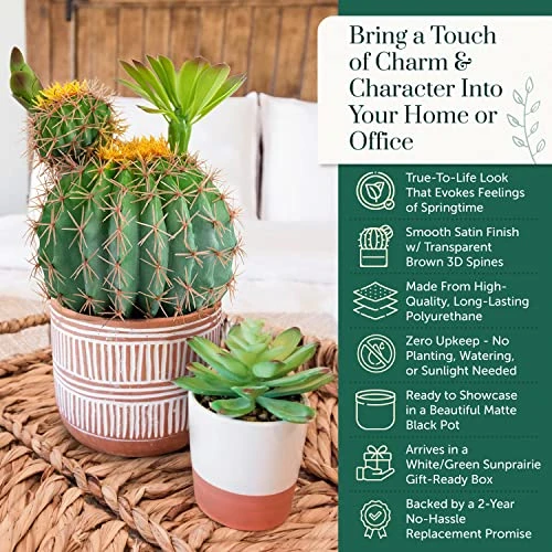 - ✅ LONG-LASTING MODERN STYLE: Our elegant plant decorations are made from high-quality detailed polyurethane and are sturdy enough to last a lifetime. In each box we have prepared a spare bag of cactus thorns for you just in case any spines get pulled out and lost. These artificial plants make for great anxiety relief items that will always bloom for you! A good indoor plant choice for your home décor! An ultra-realistic look that you’ll enjoy for years to come!